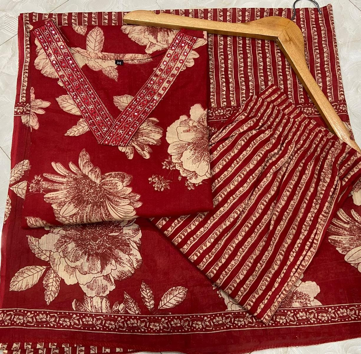 Crafted from 100% Pure Cotton fabric (guaranteed 100% quality), this set is soft, breathable, and perfect for all-day wear. The straight-fit kurta features a beautiful large-scale floral print. The highlight is the heavily embroidered V-neck border that adds a rich, designer touch.