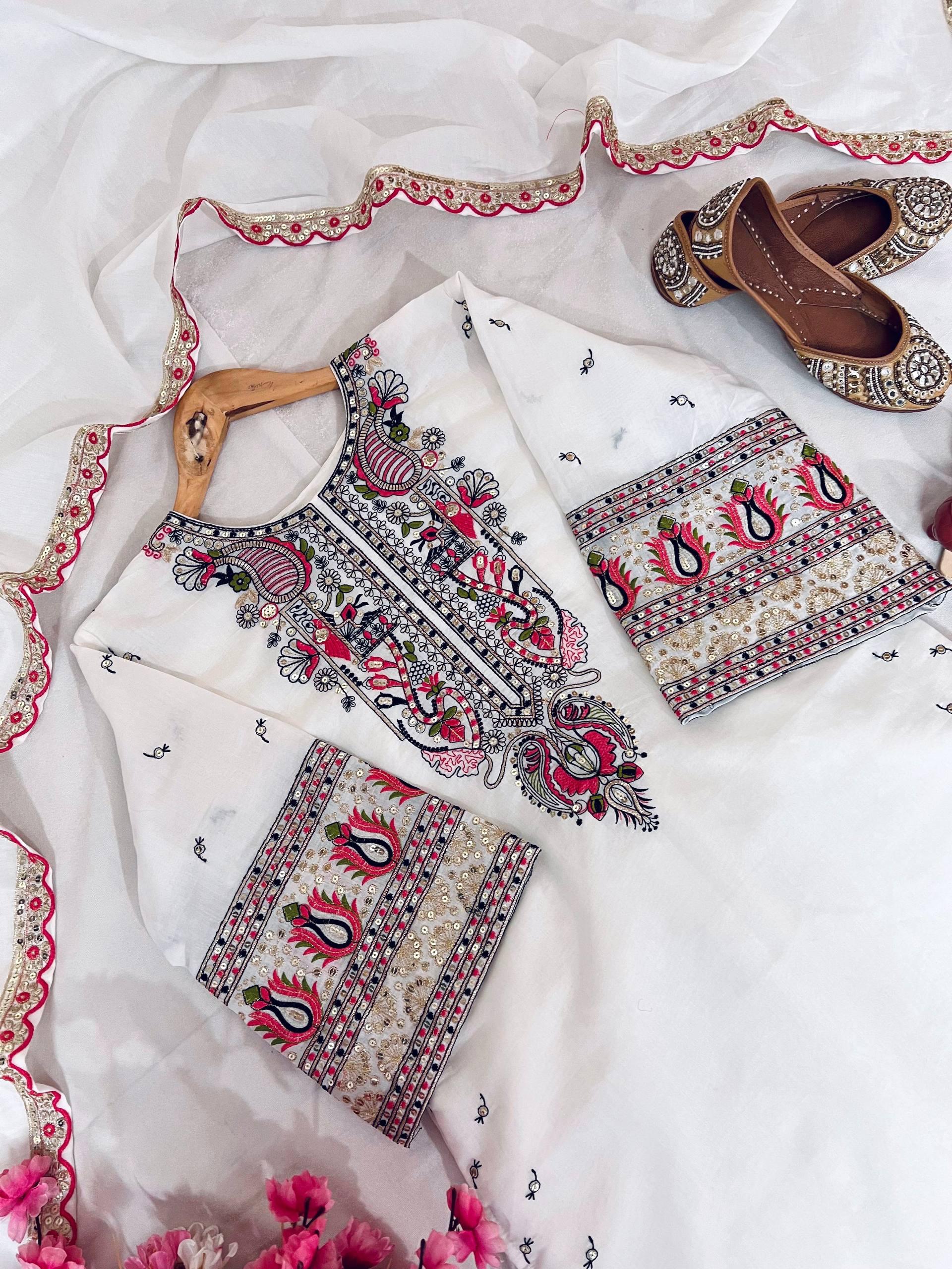 It's perfectly paired with matching Roman Silk Cotton palazzo pants (free size), which also feature the same coordinating embroidery on the border. To complete this royal look, a matching dupatta is included, finished with beautiful embroidery on all its borders. This fully stitched set is a "must-have" for your ethnic wardrobe.