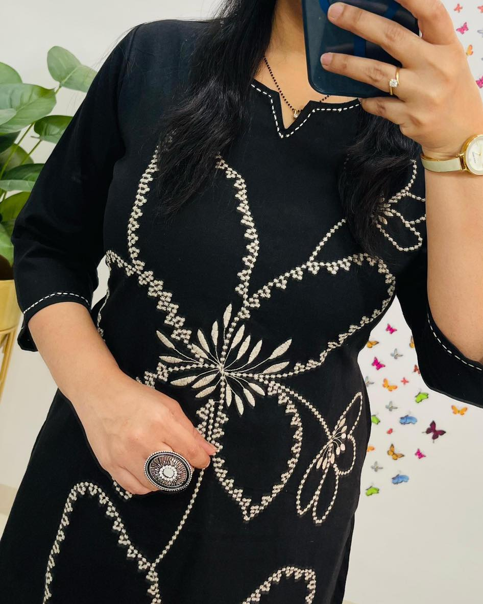 Crafted from premium, soft cotton fabric, this set is light, breathable, and perfect for long hours. The highlight is the stunning large-scale floral embroidery, created with a traditional Tagai (running stitch) work that outlines the motifs beautifully. This minimalist yet bold design is incredibly chic.