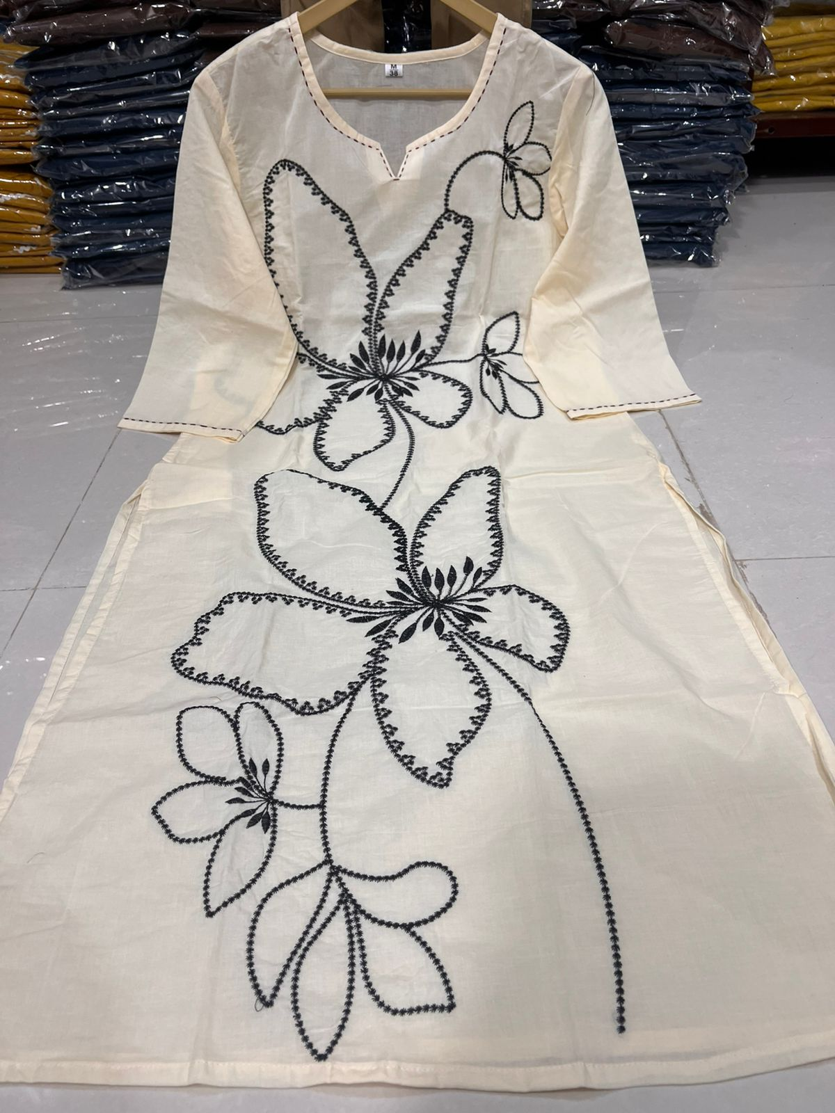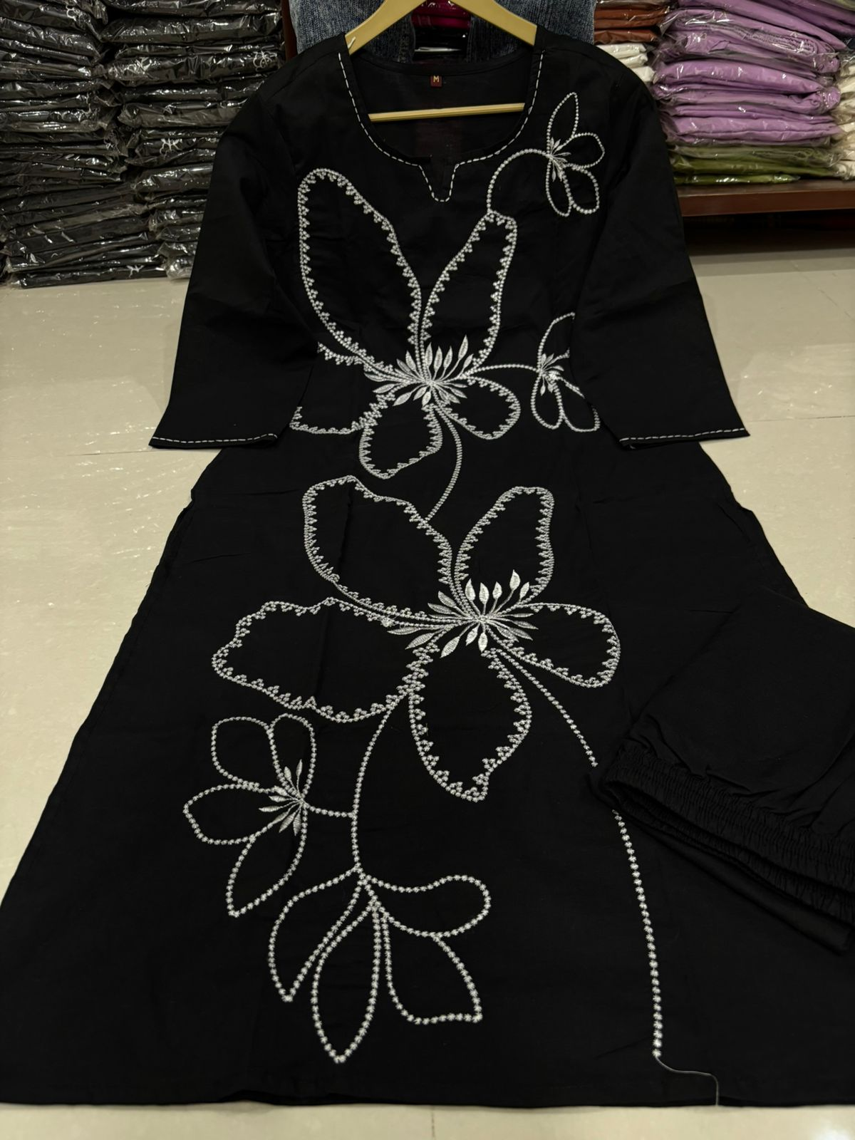 Women's Cotton Kurti Pant Set with Floral Embroidery & Tagai Work